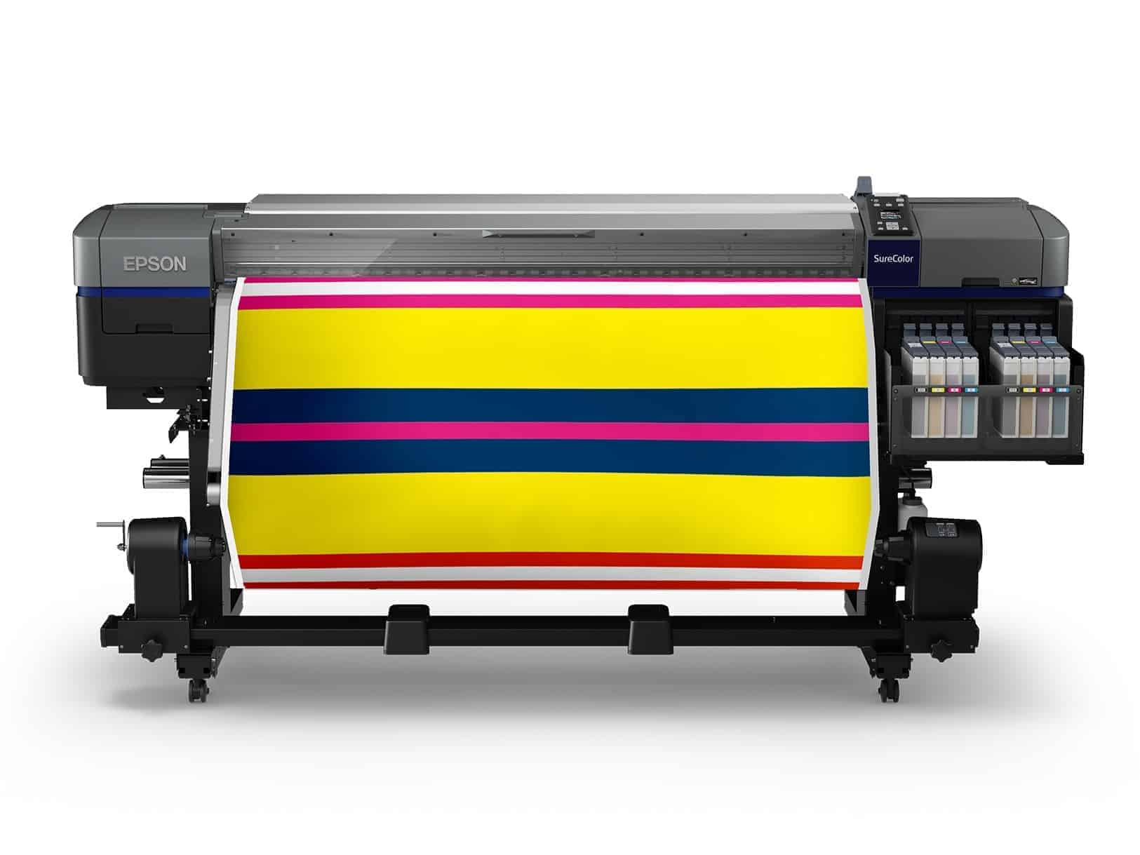 Epson stellt mit seinen beiden 64-Zoll-Thermosublimationsdruckern SureColor SC-F9400 und SC-F9400H zwei Maschinen vor, die hauptsächlich für den schnellen Druck größerer Auflagen an Kleidung, Textilien, Soft-Signage-Materialien und sonstigen Merchandise-Artikeln entwickelt wurden.