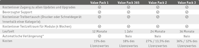 Das Value Pack ist ein Software-Maintenance- und Supportvertrag, erhältlich für alle ColorGATE Softwarelösungen. Das Value Pack bietet langfristig Sicherheit für die Investition in Ihr ColorGATE RIP-Softwareprodukt. In der Jahresgebühr sind alle Updates und Upgrades (Versions-Upgrade eingeschlossen) enthalten, damit Ihre RIP-Software automatisch auf dem aktuellsten Stand bleibt. Ferner werden Value Pack Lizenznehmer bevorzugt bei Support-Anliegen – inkl. Remotesupport - behandelt und genießen Vorteile bei der Erweiterung Ihrer ColorGATE-Systemumgebung.
