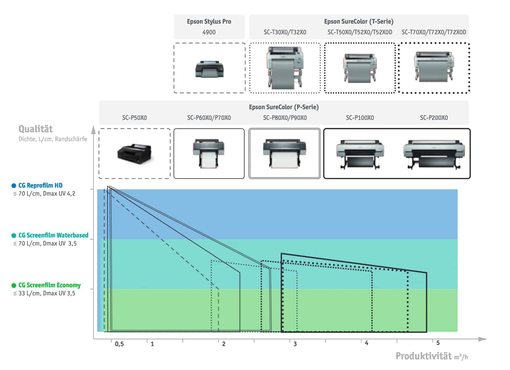 Die Infografik zeigt alle von Filmgate und Productionserver + Film and Plate Module (FPM) unterstützten Epson Drucksysteme, für den Anwendungsbereich Filmerstellung, sowie die dafür angepassten Filmmedien aus dem CG Media Portfolio. Die Kombination aus Drucker und Filmmedium ergibt einen Qualitäts-/Produktivitätsbereich, der mit dem jeweiligen Filmmaterial, CG Reprofilm HD, CG Screenfilm Waterbased oder CG Screenfilm Economy abdeckbar ist.