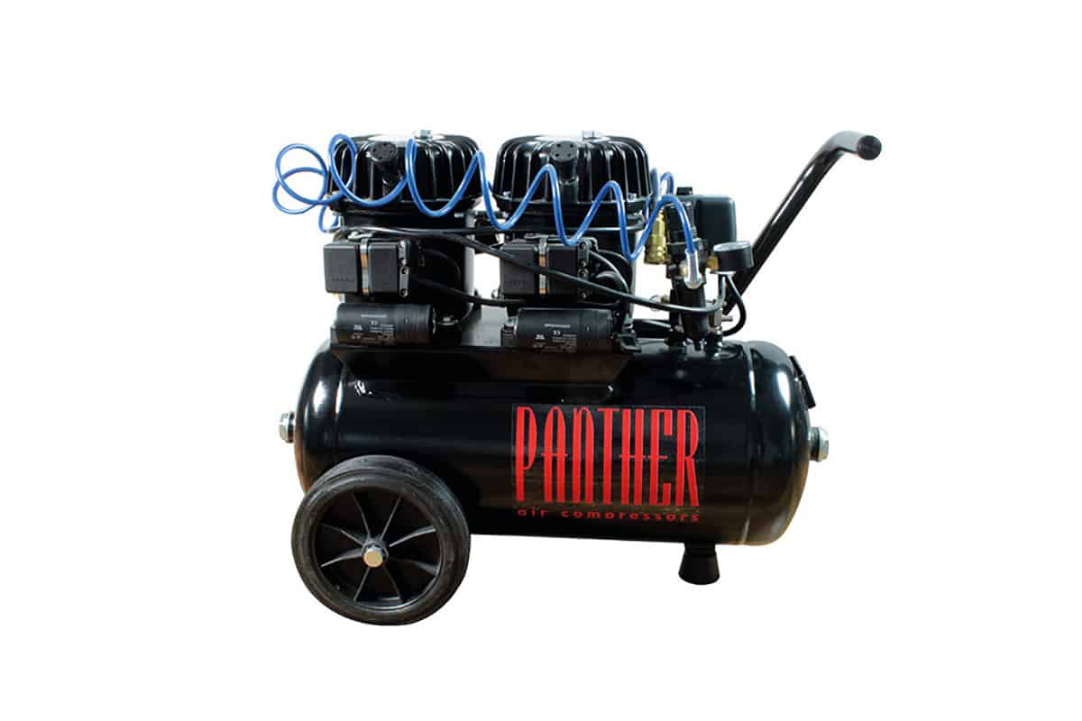 Ölgeschmierter leiser Flüsterkompressor mit 2 Motoren und einem Drucklufttank für 24 Liter. Die Lautstärke des Kompressors entspricht ungefähr dem Summen eines Kühlschranks. Nicht umsonst zählt dieser Kompressor zu den leisesten Kompressoren der Welt.