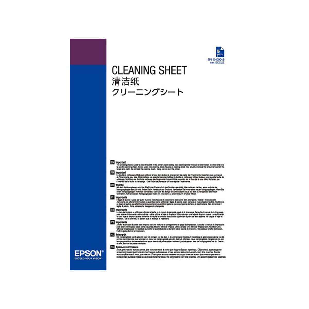Das Paket besteht aus fünf Blättern EPSON Reinigungspapier C13S400045. Jedes Blatt verfügt über eine Seite mit selbstklebender Oberfläche. Dadurch werden Staub und andere Partikel von dem antistatischen Tuch entfernt. Die Reinigung ist schnell und einfach und ein einzelnes Blatt genügt in der Regel für einen vollständigen Reinigungsvorgang. Dieser Vorgang sollte mindestens einmal pro Jahr ausgeführt werden.